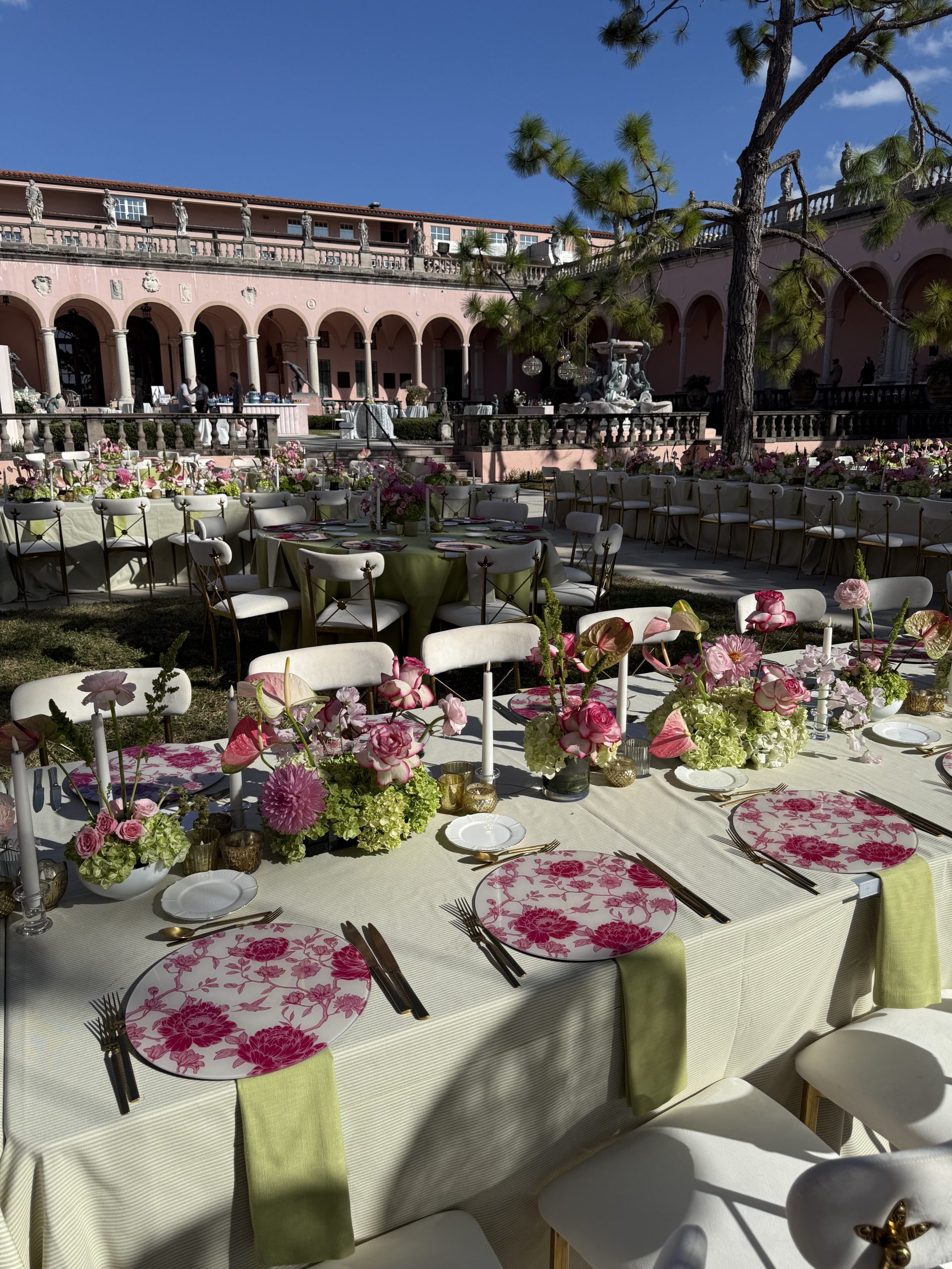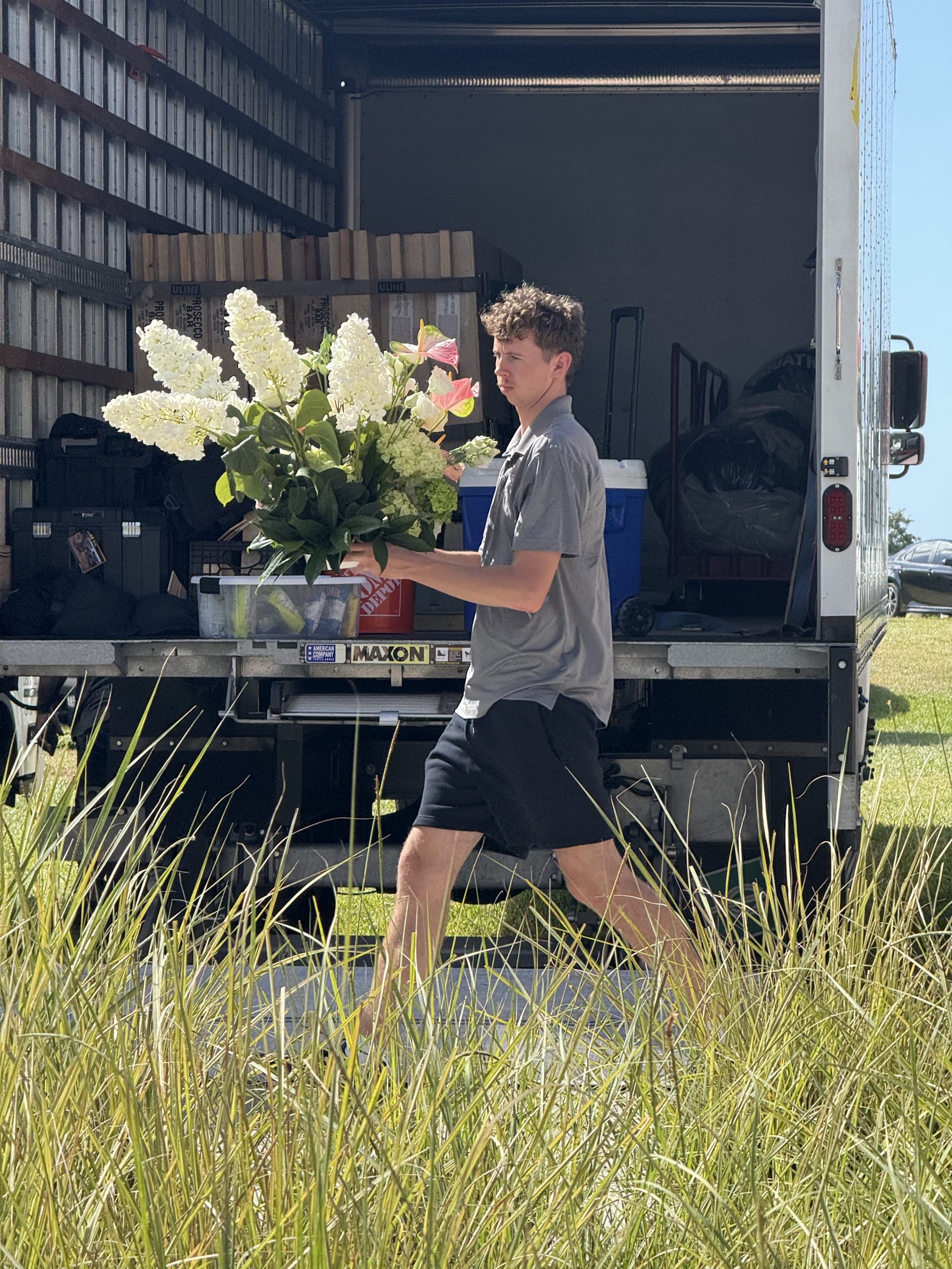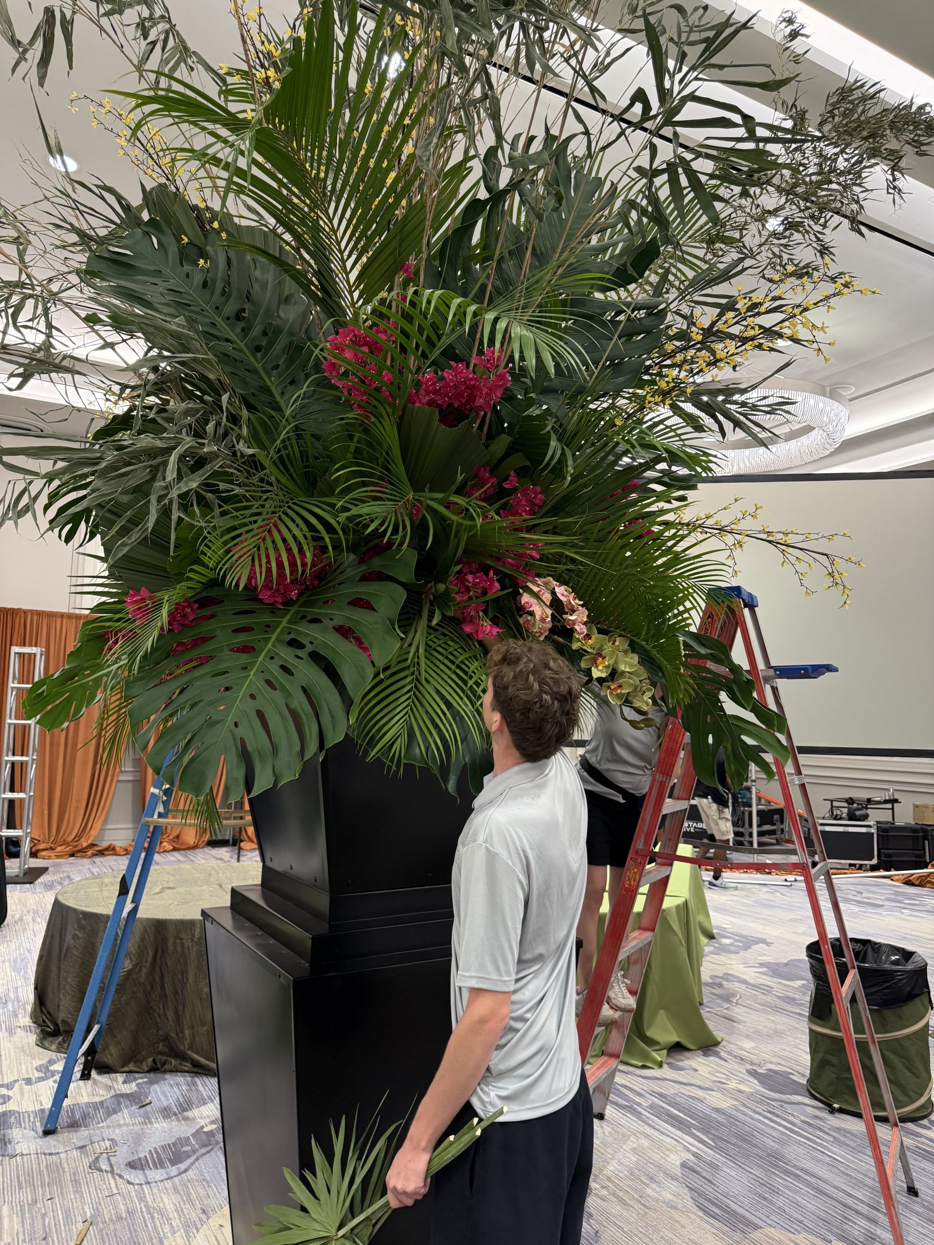 Mason’s internship coincided with two significant events that showcased the scale and sophistication of Botanica’s work. The first, a $300,000 gala, included draping, custom linens, furniture, and florals for 70 tables—22 of which featured multiple long arrangements—as well as stage décor and four towering statement pieces reaching 15 feet high. The second event was a luxury wedding at the Ringling Museum, featuring personal florals, a grand ceremony setup, and a lavish reception. Despite challenges with wind and timing, the Botanica team demonstrated professionalism, creativity, and problem-solving at every turn.
